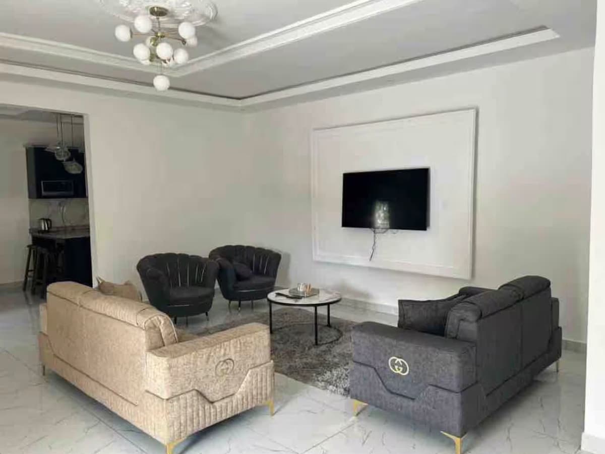 Un condominium de classe, regorgeant deux grandes chambres avec des douches internes toutes climatisées, une autre toilette pour les invités , Quatre grands balcons aux deux extrémités. Un concierge sur place pour vos besoins et des vigiles pour votre vie privée. Les visites sont autorisées par vous. L’électricité et l’eau sont couramment régulières. Pourquoi payer 300 euros à Sheraton pour une chambre tandis que vous avez toute cette panoplie pour vous. Pensez y. Nous sommes là pour vous .