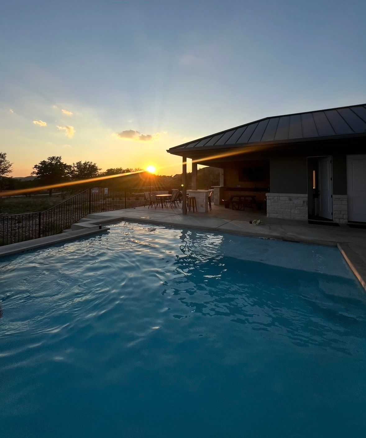 "Amadeo" is a secluded 9 acre get away on Saddle Mountain all to yourself, not shared. 2 cabins with 2 full baths & glorified outhouse/shower by salt water pool & spa. Outdoor lounging, covered dining areas, game area, star gazing by the fire pit. We are located 1 mile from river crossing, 5 mins from town, 10 mins from Garner. Beautiful sunsets and view of the hills, also hiking. Each cabin has queen bed, full loft, full futon couch, covered porches. We also love our guests’ fur babies!