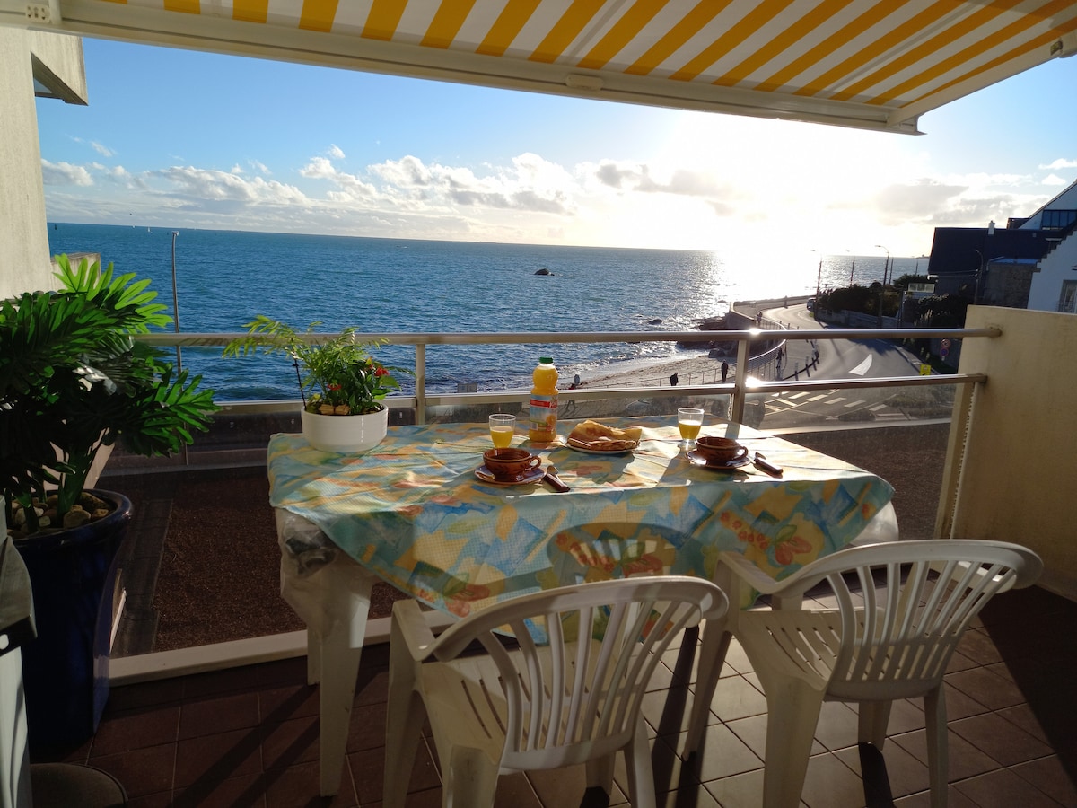 Studio totalement privatif 30m2, vue mer sur la baie et jardin, pour 2 personnes. Fait partie d'une maison avec une entrée séparée (porte du garage). Très propre, coquet, calme, lumineux : kitchenette, salle de bain/WC, placard, parking gratuit juste devant le studio Chauffeuse pour 1 enfant/ado : 12€ sup/jour Situé à 5mn à pied de la plage « Sables Blancs ». Centre-ville : 5mn en voiture, 40mn à pied Linge de toilette & draps fournis Arrivée 14h30, départ 11h