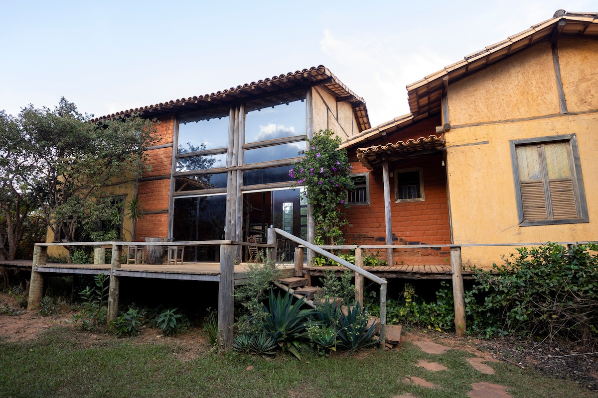 Este lindo chalé de bioconstrucao super confortável, acomoda 01 casal. Localizado em meio a natureza incrível do Tijucal, área rural de Conceição do Mato Dentro, é perfeito para casais que querem tomar um vinho a beira do fogão a lenha e desfrutar deliciosos banhos de cachoeiras localizadas no próprio terreno. Disponíveis também para os hóspedes frutas da época, horta orgânica e ovos caipiras A piscina natural e a cachoeira são comuns aos hóspedes das duas casas disponíveis para alugar.