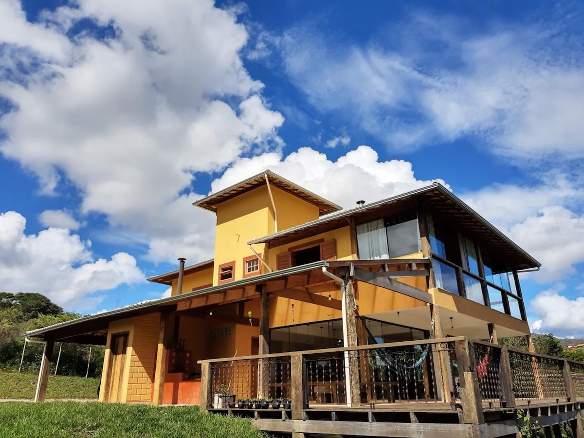 Casa inteira na Lapinha da Serra com varandas, deck, piscina e vista privilegiada para serra há só 5 minutos a pé do vilarejo. • 2 suítes completas + 1 quarto c/2 camas de solteiro e 1 BELICHE ( mais adequado para 2 crianças) • Banheiro social -Cozinha completa com freezer externo e Air fryer -Adega para vinhos -Sala com lareira -Sala de TV c/ SKY e DVD -Varanda lateral com mesa e fogão à lenha - Varanda com deck e piscina -Chuveiro externo -Churrasqueira portátil -Wi-Fi
