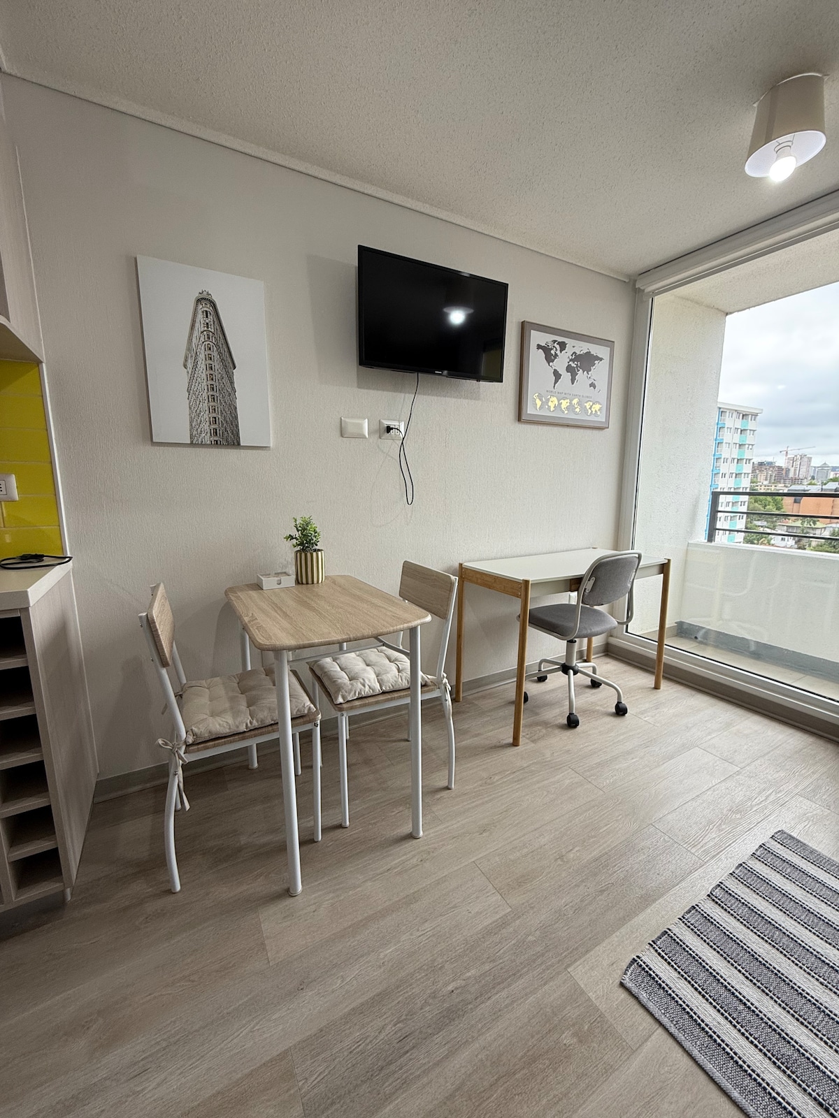 Disfruta de este departamento nuevo, full equipado para dos personas, cerradura inteligente, céntrico y muy cómodo, ideal para alojarse en Concepción. A pasos de la Universidad de Concepción, Hospital Regional, Tribunales, etc El edificio cuenta con Seguridad conserjería 24/7, Circuito Cerrado de Tv, Estacionamiento privado Subterráneo y Lavandería del edificio