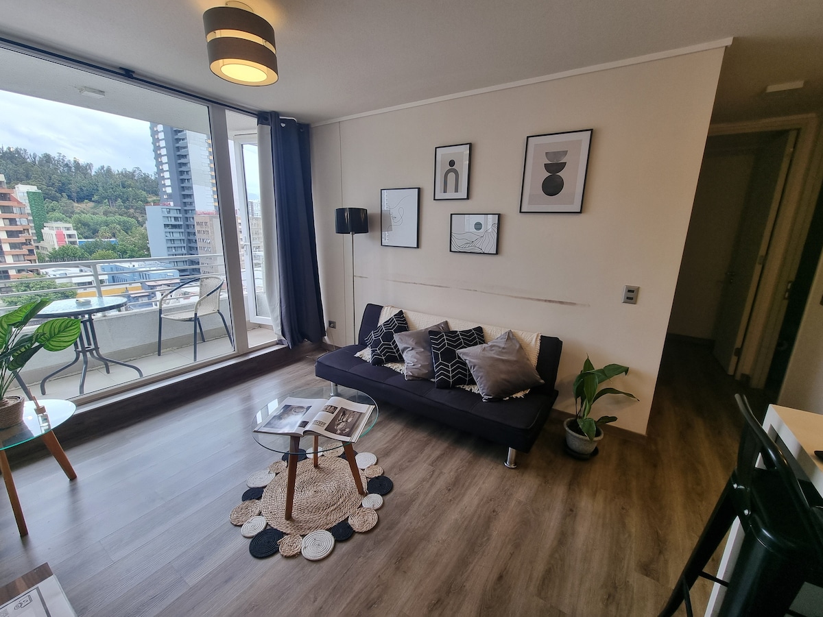 Departamento nuevo , moderno de 2 ambientes full equipado . Orientación Nororiente , otorgando sol de mañana , medio día y una linda vista a la ciudad . Ubicado en una de las calles mas importante del Gran concepción . Cercano a Supermercados , Bancos , Mall , Hospital , Universidades , Parques y restaurantes . Un espacio ideal para conocer la ciudad en un entorno seguro y acogedor . *NO HAY ESTACIONAMIENTO*