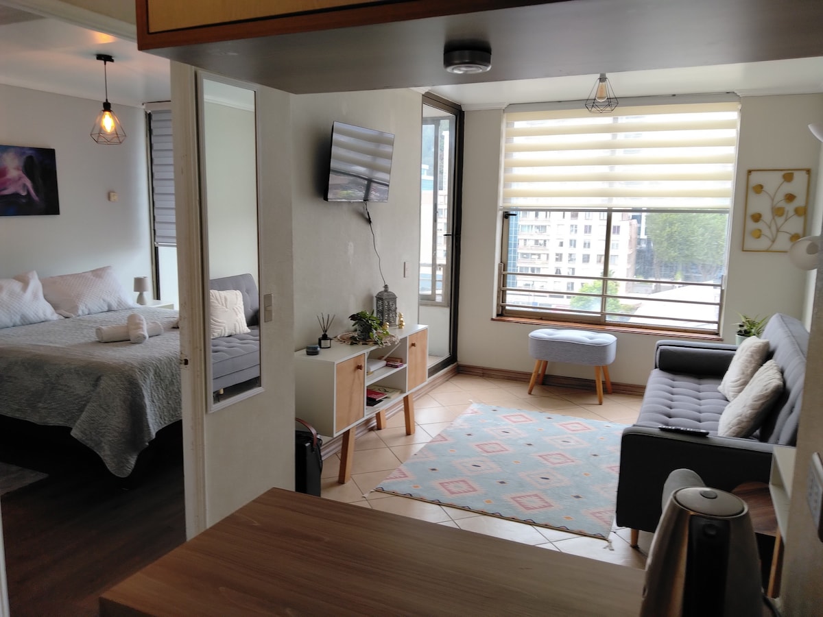 Disfruta de una experiencia con estilo en este alojamiento céntrico, cómodo y full equipado: - Ideal para 2personas - 1 cama queen + 1 futón - Wifi, SmartTV+3000canales(fútbol incluido)Netflix - Cocina full equipada. El edificio ofrece gimnasio y sala de cowork. A 3min del terminal, estadio, universidades, lavandería, farmacias y supermercados. Con locomoción a la puerta, conectividad ideal. Cuenta con conserjería 24/7. Perfecto para descansar, trabajar o explorar la ciudad.