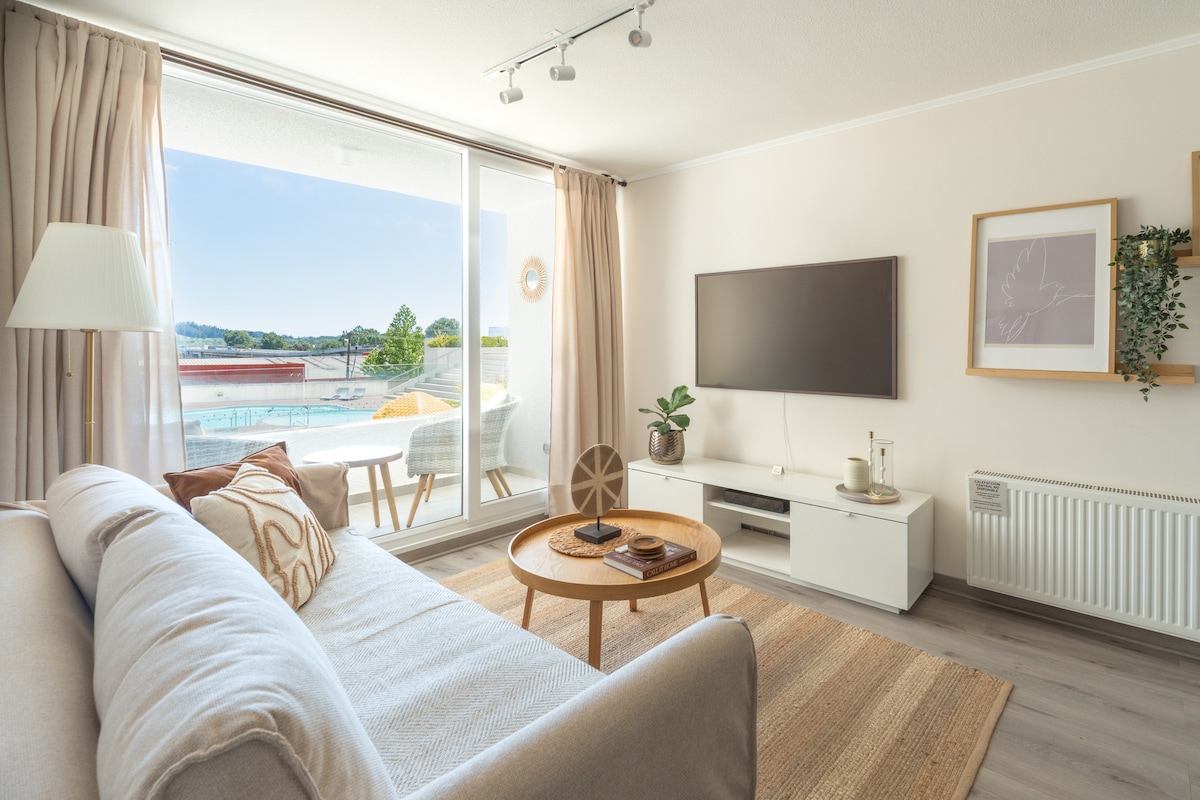 Disfruta de una estadía cómoda y conveniente en este amplio departamento nuevo de 1 dormitorio, ubicado junto al Parque Ecuador, en el corazón de Concepción. Relájate con una hermosa vista a la piscina y aprovecha un espacio completamente equipado para que no te falte nada. Su excelente ubicación te permite moverte fácilmente a pie, en transporte público o en vehículo. Ideal para viajeros de negocios, turistas o quienes buscan un descanso en la ciudad.
