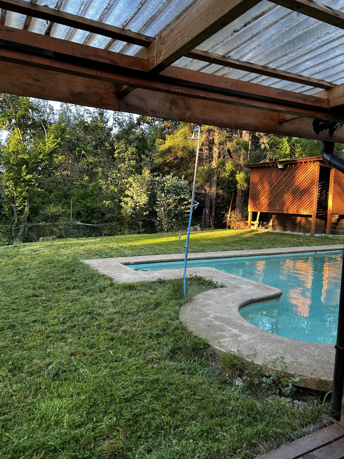 Un espacio pensado para conectar con la naturaleza y vivir momentos inolvidables. Disfruta del verde, la paz del campo y el ruido del estero. Preciosa cabaña campestre a orillas del estero poñén. Con tinaja y terraza con parrilla privada. Cuenta con una habitación matrimonial y otra habitación doble. Adicional un futón. Baño completo con agua caliente. Comedor y sala con estufa a combustión lenta. Cocina completa. Estacionamiento privado.