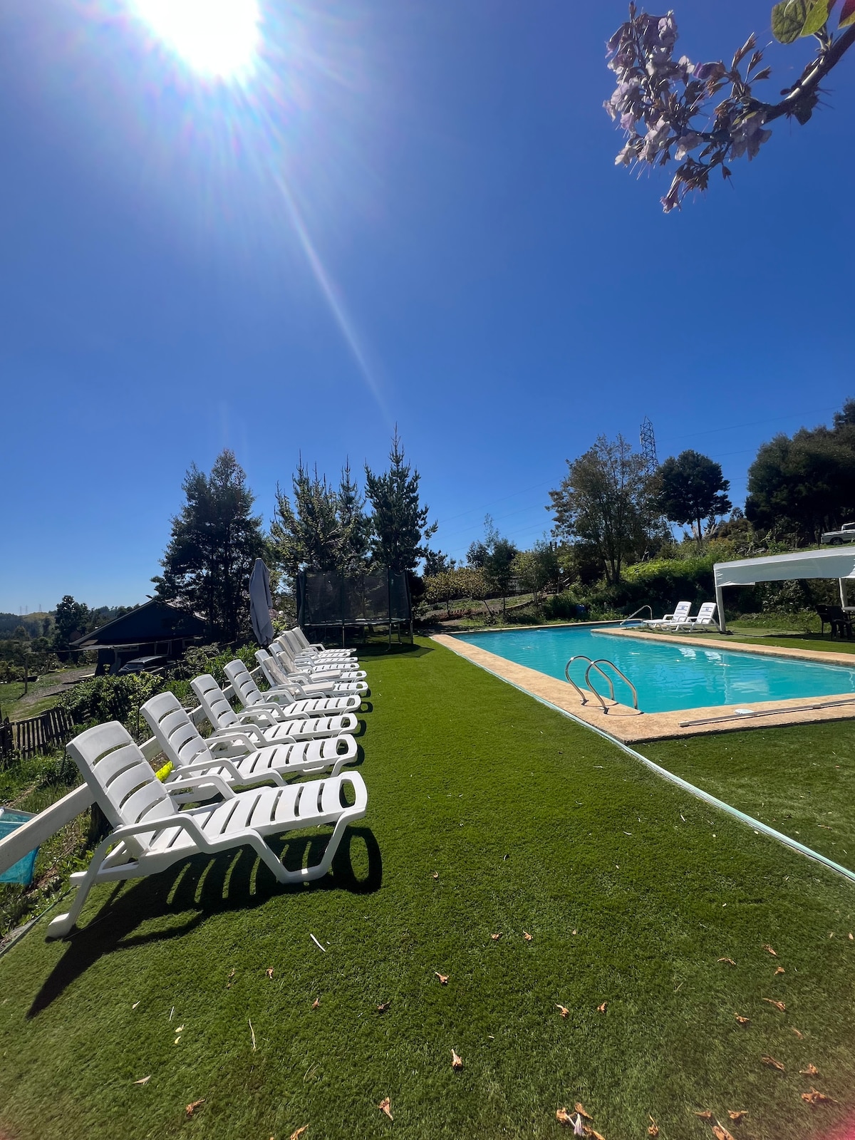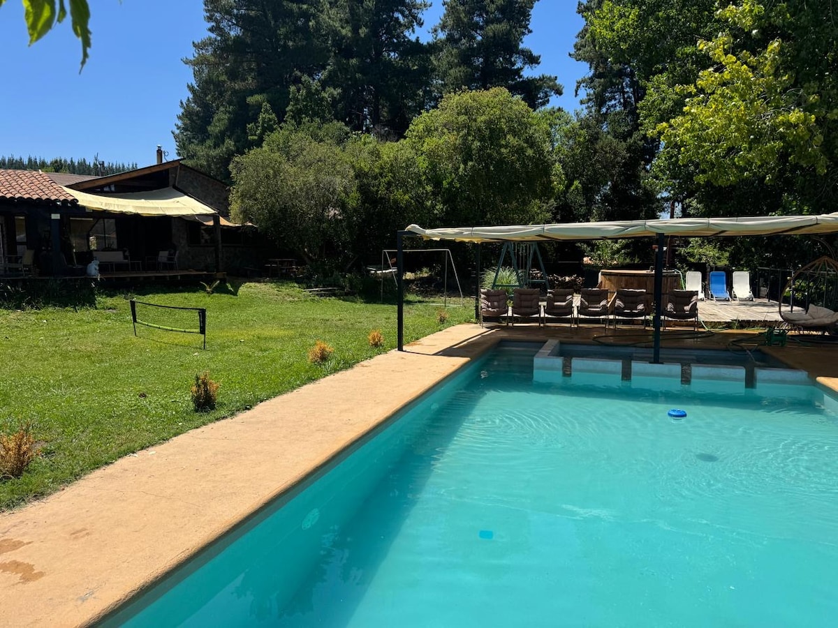 Cabaña única, rústica amplia con piscina y tinaja, capacidad 6.-7 personas para alojamiento. cuenta con 1 cama king, 1 de 2 plazas , 2 de plazas y media, y 1 sofá cama.- 1 loft y 1 dormitorio concepto abierto. Terraza exterior, estacionamiento privado y áreas verdes. A diez minutos de hualqui. Valor tinaja uso libre: $20.000 adicional NO INCLUYE TOALLAS. El lugar también es apto para eventos (cumpleaños, bautizo, etc) con una tarifa diferente, si el grupo supera a 7 personas.