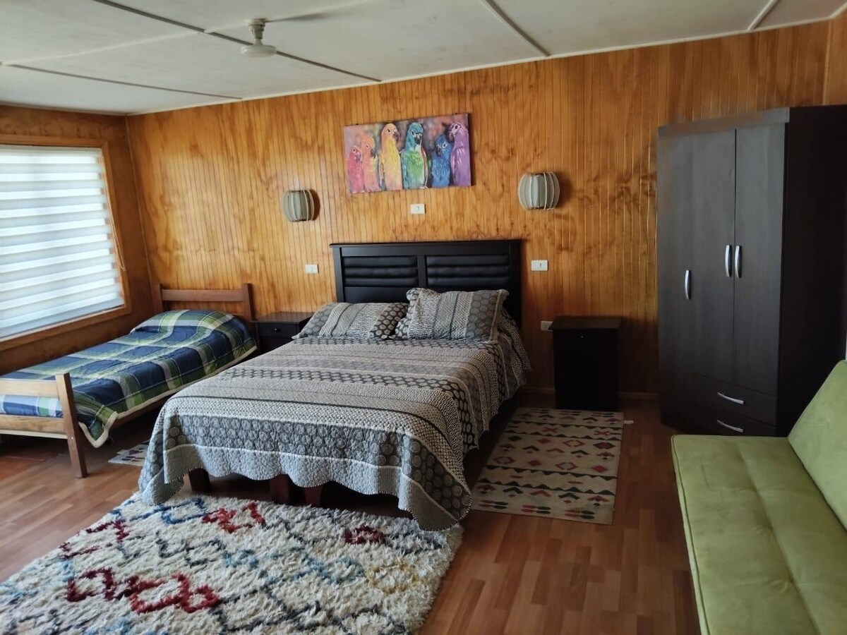 Acogedora habitación frente al mar, ubicada en el segundo piso de nuestro restaurante. Ideal para quienes buscan descanso, buena comida y una vista inigualable. Cuenta con baño privado, calefacción, hervidor y tazas (sin cocina ni refrigerador). Incluye un 10% de descuento en toda la carta. Estacionamiento disponible dentro del recinto, a pasos de la playa y con un ambiente tranquilo para disfrutar del entorno costero.