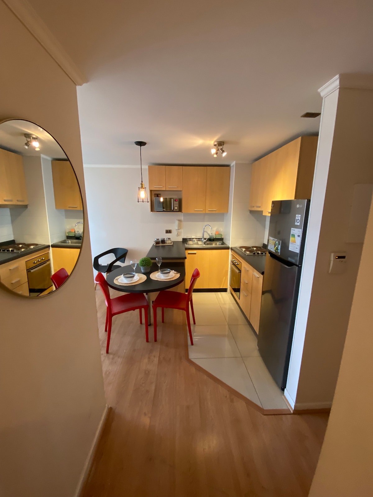 Departamento nuevo, full equipado, ubicada frente al estadio, a 1 cuadra del terminal de buses. Estacionamiento privado, techado, gratis (el conserje abre y cierra el portón, es sin control remoto). Tranquilo y discreto, céntrico, excelente locomoción. Con aire acondicionado para el frío y el calor. Con ingreso autónomo al departamento con teclado y clave (sin llave, la clave es la llave). Conserje 24 horas al día. Sector tranquilo y residencial. No se puede fumar dentro, sólo en el balcón.