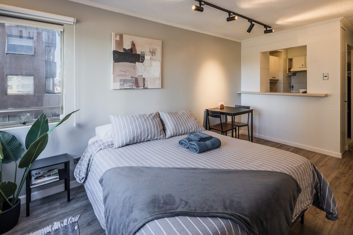 Disfruta de una estadía cómoda y moderna en pleno centro de Concepción. Este acogedor departamento te ofrece todo lo que necesitas: 1 dormitorio, cocina equipada, WiFi, TV y excelente conectividad. Ideal para viajes de trabajo o descanso. A pasos de supermercados, universidades, restaurantes y locomoción. Edificio seguro con acceso controlado.