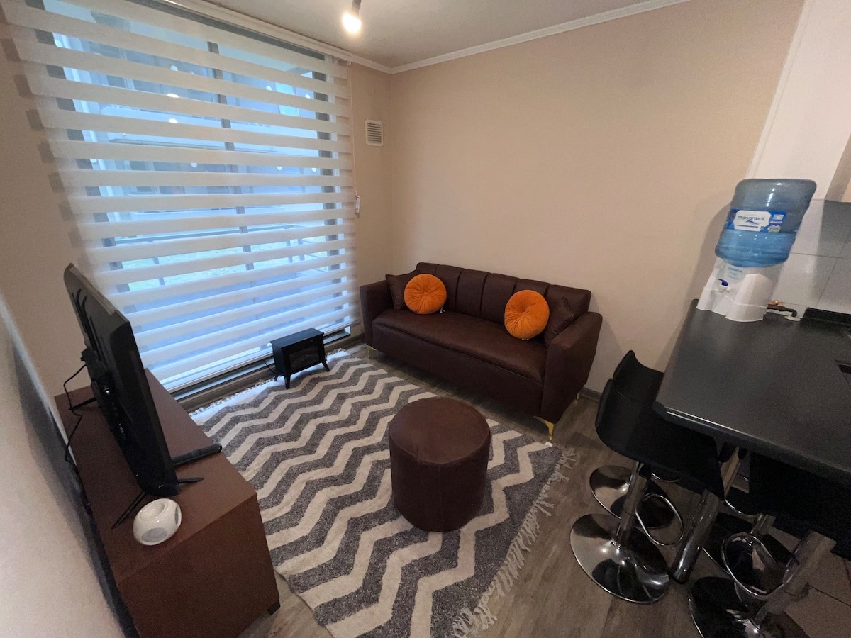Disfruta de la comodidad de este departamento nuevo, central y muy tranquilo. Totalmente equipado, full eléctrico, con wifi para poder trabajar tranquilo y Smart TV Full HD para los momentos de Relax. Cuenta con : secador de pelo, toallas , ropa de cama, calefacción, plancha, etc. Podrás disfrutar de una linda vista panorámica al rio Bio bio y está cerca de todo, supermercado y el parque Ecuador. Completamente seguro y conserjería 24/7.