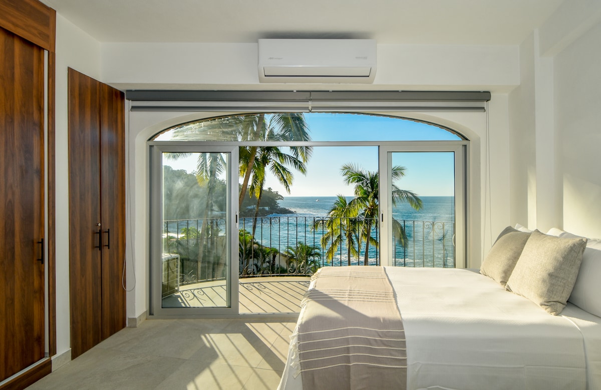 ★Breathtaking Views of the Bay ★SMALL shared dipping pool ★English TV USA-CAN Channels & Sports ★Very high-speed WIFI (200 Mbps) ★King Bed ★7 minutes walking to town ★Filtered Drinking Water ★ Free Parking ★Panoramic view of the Bay ★ We accept your pet less than 20kg/45lb (dog/cat) ★ AC in bedroom. ★ Uber to and from Old Town or the beach is only $2-3 USD ★Local Host, born and raised in PV ★The location is near the MARCELA Resort, Blue Chairs & Casa Cupula ★68mt² (723 sf) plus balcony