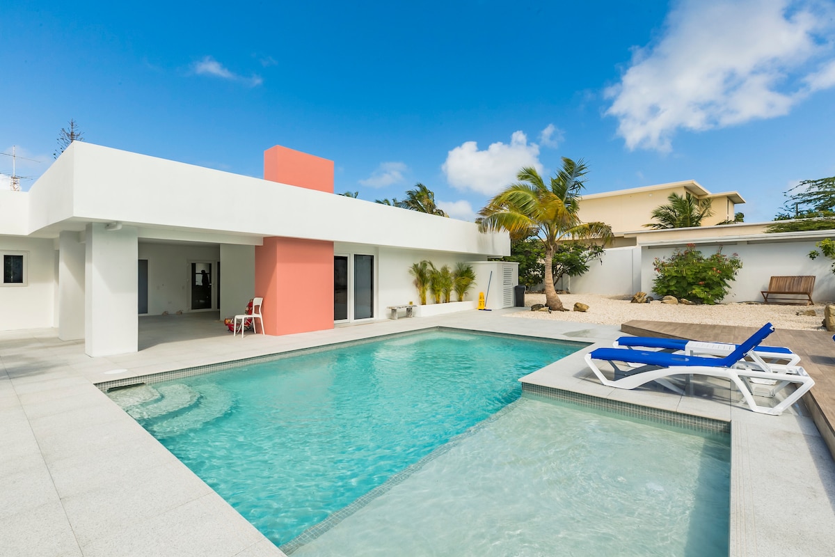 Are you looking for the ideal villa with private pool and just a 3 minute drive to the best beaches in the world? Don't look further and welcome to Blue Villa! Blue Villa is a 1500 sq. ft. modern home designed as the perfect vacation retreat. This 2 bedroom/2 bathroom villa with private pool and large garden is located only a 3 minute drive from Palm Beach and close to the best restaurants and casinos. Escaping cold weather for a longer period? Multiple months rent is also possible.