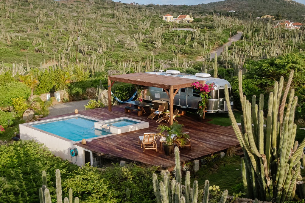 This beautifully appointed Eco friendly 30' Feet Flying Cloud RV is the only luxury Airstream glamping experience in the Caribbean. Located in peaceful nature on the North Coast of Aruba, featuring a private, deep saltwater pool and amazing cacti and ocean views. Exceptional service with attention to detail prioritizing sustainability. Connecting guests to unique local experiences and products, creating a truly one of a kind vacation. Looking for the coolest stay in Aruba? This is it!