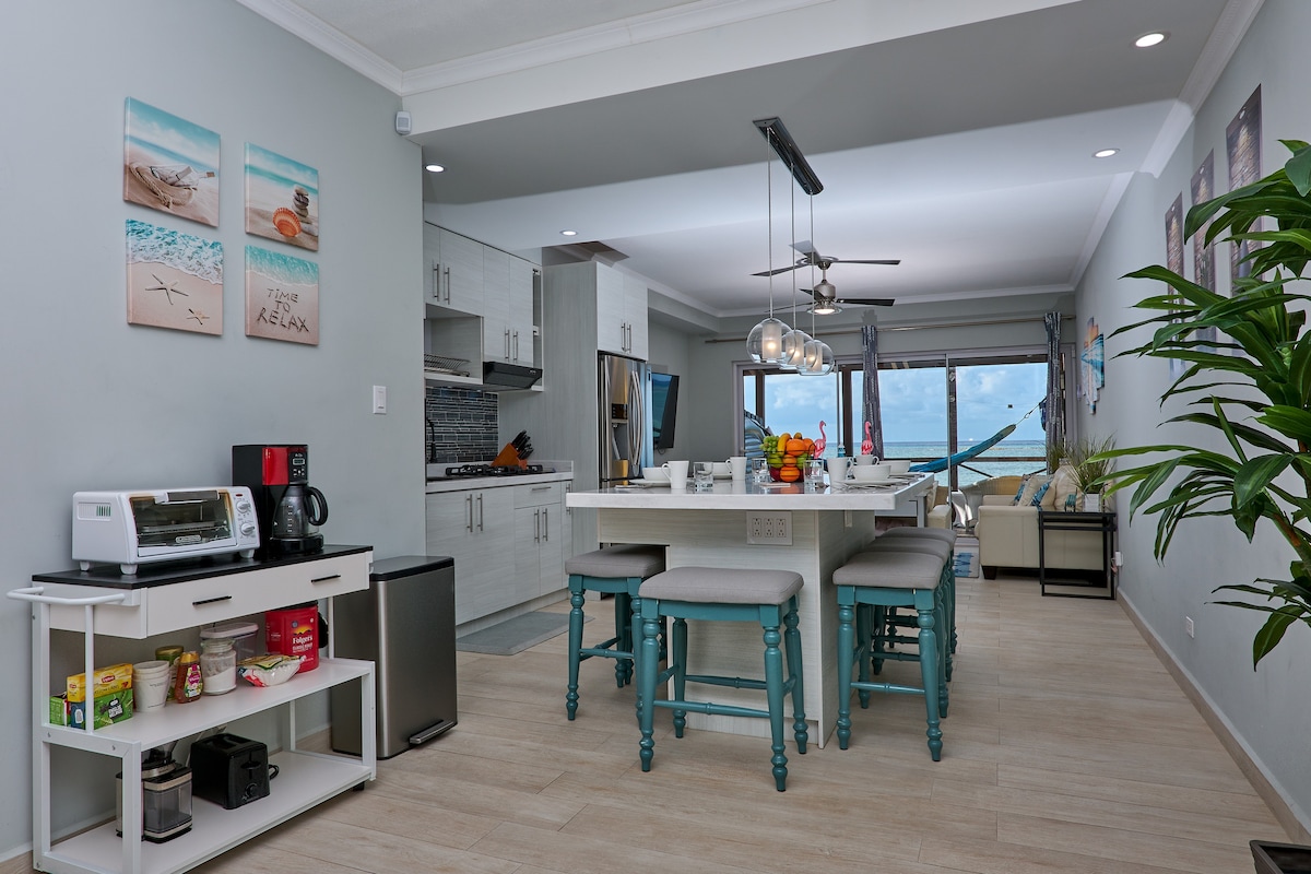 Escape to Paradise! Wake up to waves gently lapping at the shore, just 12 feet from your private beach. Our oceanfront chalet is perfect for any occasion. Unwind in style: - Fall asleep to the sound of waves - Watch pelicans dive in turquoise waters - Savor wine during breathtaking sunsets - Romantic couples' shower in luxurious master bath Luxurious furnishings and attention to detail await. Create unforgettable memories with us! We can't wait to welcome you to your own private paradise!