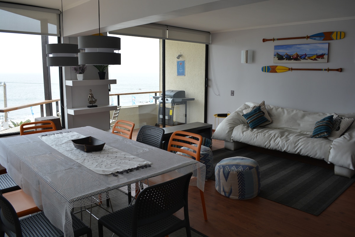 ¡Bienvenido a nuestro acogedor departamento en primera línea de playa en Reñaca! Disfruta de una vista impresionante del océano desde cada rincón. Características: Ubicación Ideal: A pasos de la playa y cerca de restaurantes y tiendas locales. Comodidades Básicas: Wifi, Smart TV. Equipamiento completo para 6 personas. Estacionamiento para 2 autos.
