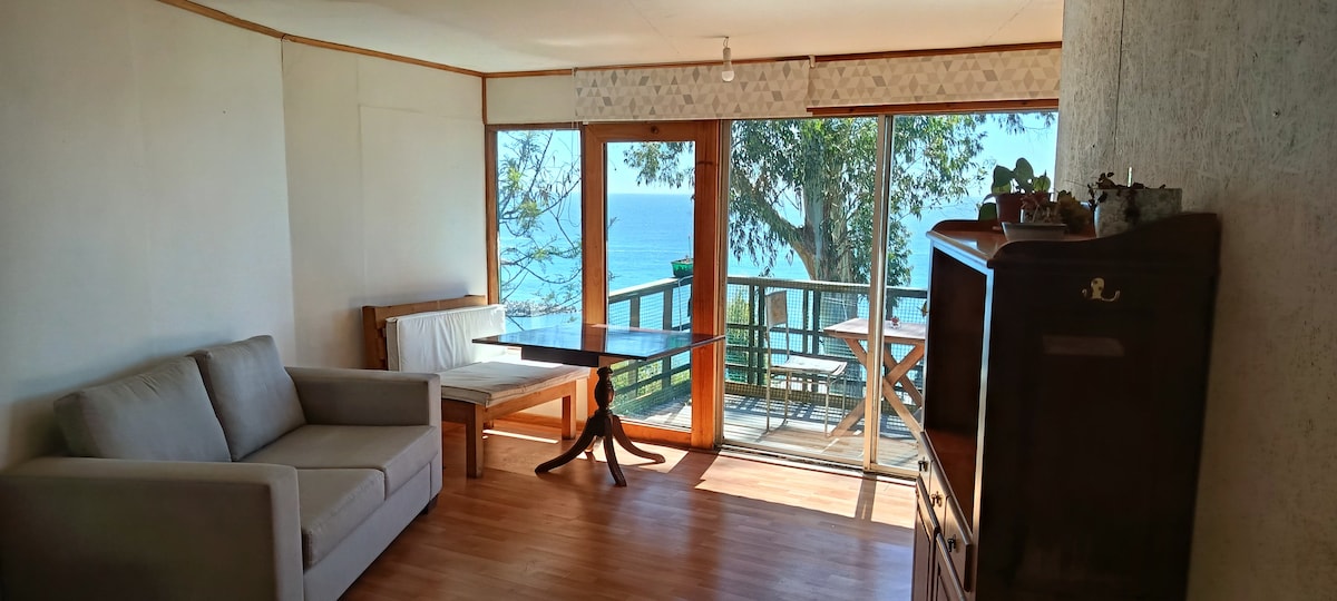Este lugar tiene una ubicación estratégica: ¡será muy fácil planear tu visita! la cabaña ( a estrenar)está en un bosque ,con la mejor vista al mar ,al lado de la escala a la playa y a dos cuadras del comercio y locomoción,barrio recidencial,cuenta con estacionamiento privado,lugar para descansar y disfrutar de la vista y sonido de los pajaros y el mar,no te arrepentirás!