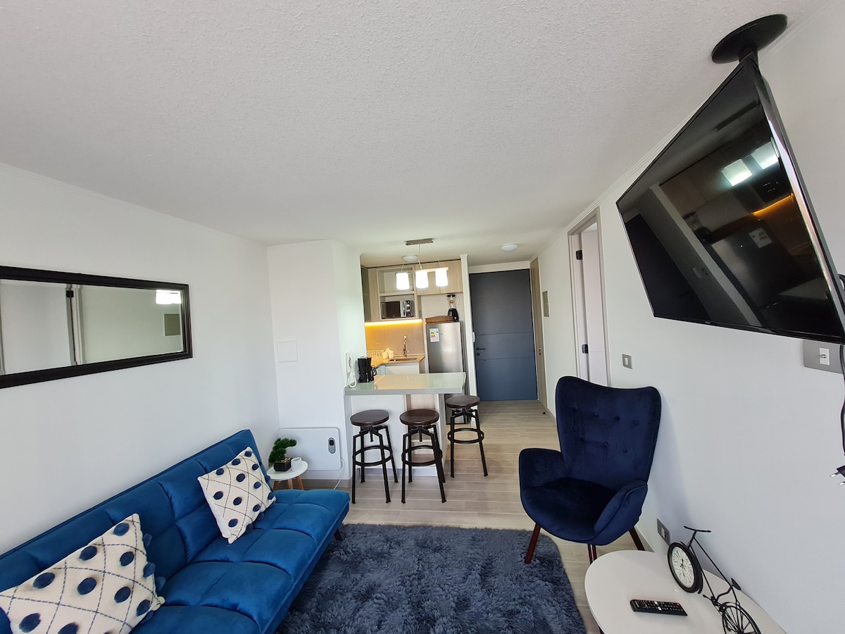 El departamento está en el piso 17, se encuentra completamente amoblado, Cuenta con una habitación con cama de 2 plazas y un futón en el living que se trasforma en cama de 1 plaza. baño totalmente equipado. Tiene con wifi y tv cable, estacionamiento privado. Se encuentra ubicado al frente de las dunas de Concón, a 5 minutos a pie del barrio gastronómico, muy cerca de supermercados, es un barrio residencial y tranquilo. Locomoción colectiva a la salida del departamento.