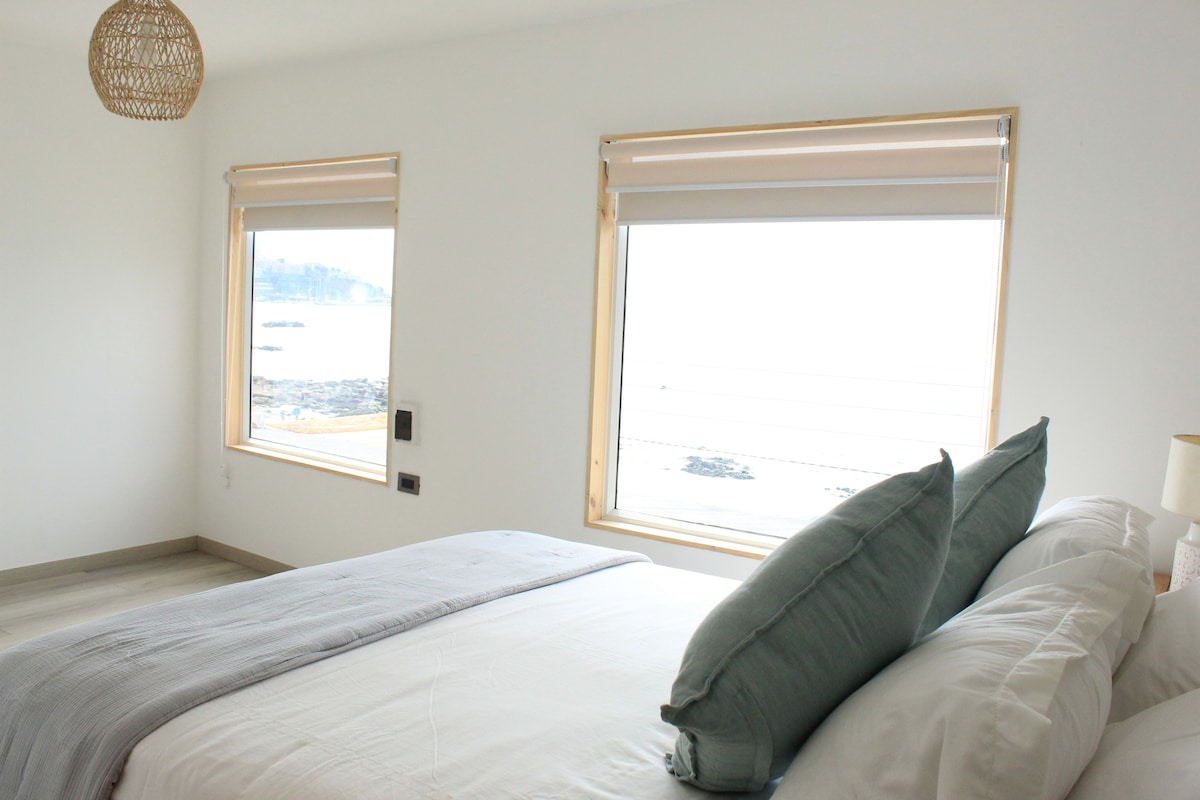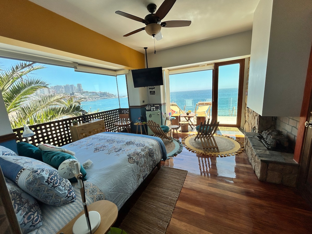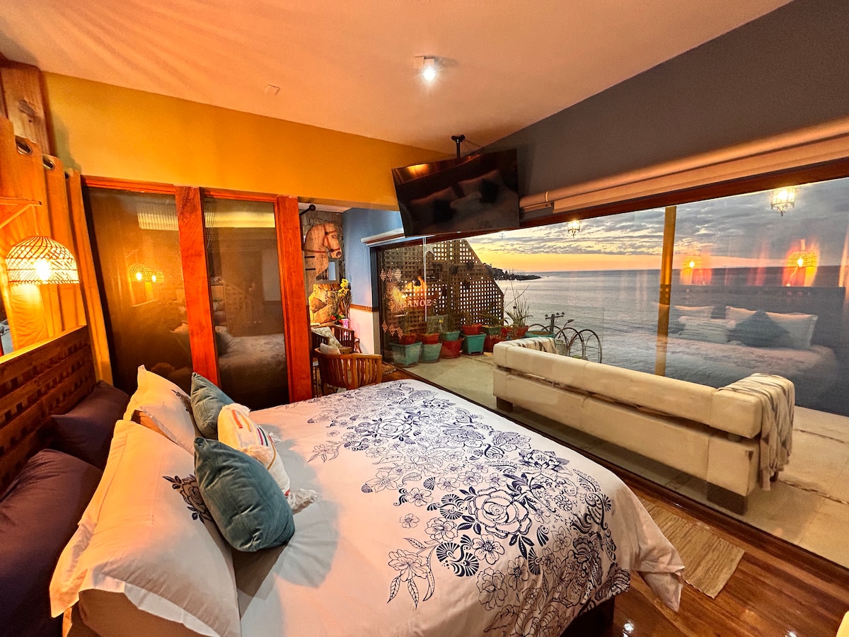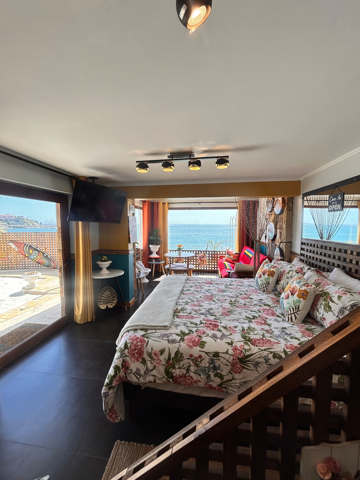 Una habitación luminosa con ventales que ofrecen una vista espectacular al mar. En el centro, un jacuzzi moderno invita a relajarse mientras se disfruta del paisaje. La decoración minimalista y cálida, con tonos neutros y relajantes. Lahabitacion incluye; piscina, cama king, desayuno continental, frigobar, calefacción, smart tv, wifi, cable, estacionamiento. El ambiente tranquilo y cómodo, acompañado del sonido de las olas, crea el refugio perfecto para descansar y disfrutar del entorno.
