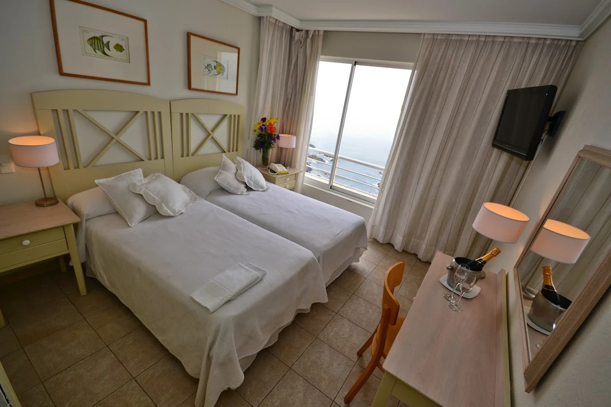 Una habitación luminosa con ventales que ofrecen una vista espectacular al mar. En el centro, un jacuzzi moderno invita a relajarse mientras se disfruta del paisaje. La decoración minimalista y cálida, con tonos neutros y relajantes. Lahabitacion incluye; piscina, cama king, desayuno continental, frigobar, calefacción, smart tv, wifi, cable, estacionamiento. El ambiente tranquilo y cómodo, acompañado del sonido de las olas, crea el refugio perfecto para descansar y disfrutar del entorno.