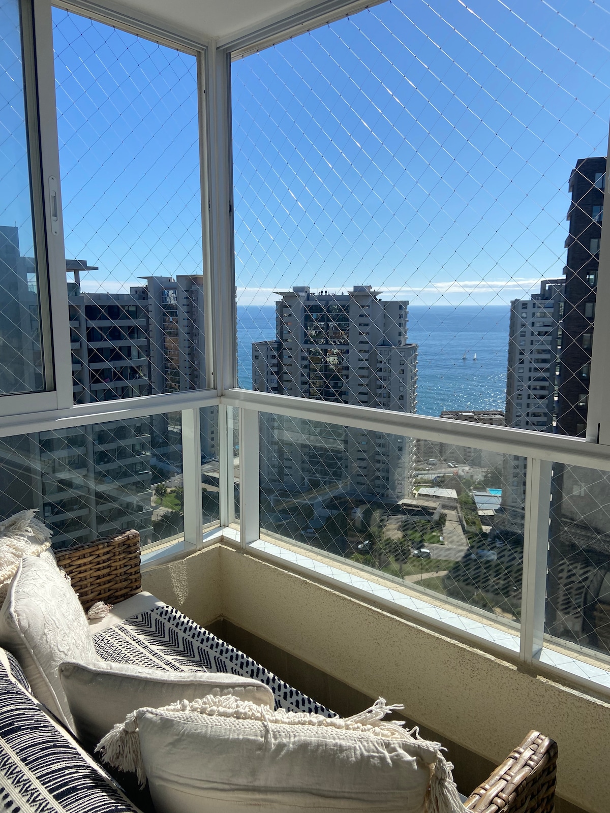 Espectacular departamento en Concón con vista al mar y piscina temperada. El departamento cuenta con áreas verdes y juegos infantiles, piscina al aire libre, amplia terraza privada con vista al Océano Pacífico. Hay servicio de sauna (de pago). Se encuentra a pocos pasos de las Dunas de Concón, supermercados, restaurantes, bares y del parque Costa de Montemar. A minutos caminando a playa Los Lilenes. Se cuenta con Wifi y Smart TV en el dormitorio, estacionamiento privado.