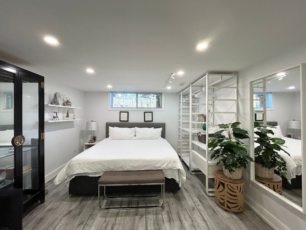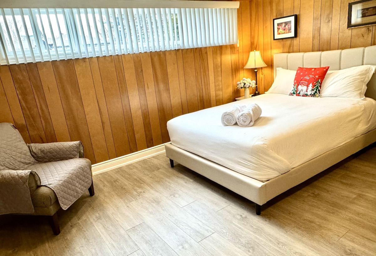 This cozy private house features a master bedroom with a king-size bed, desk, chairs, sitting area, and private bathroom. 3 other bedrooms include 1 queen & 2 double beds. Other amenities include a second full bathroom, and laundry on the 2nd floor, a fully-equipped kitchen and living room, a private entrance, and two parking spots on the driveway. Conveniently located near Promenade Mall, stores, and restaurants, Lily's house is the ideal spot for your getaway. (Basement locked for storage)
