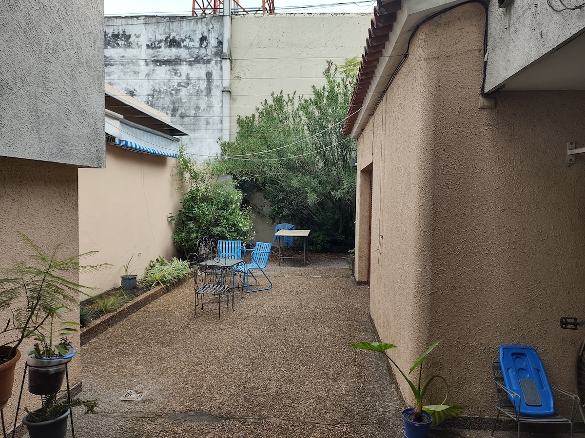 “Un lugar para compartir” es mi taller de fabricación de cajas y bolsas (Un mundo de cajitas) que lo adaptamos para recibir a huéspedes de todo el universo! Independiente de nuestra casa. Baño privado con calefón. Aire acondicionado frío/calor. Heladera y microondas. Excelente señal de wifi. Tiene tres ventanas que le dan mucha claridad, ventilación y vista al Parque Solari. Un deck al fondo para descansar. Te va a cautivar el lugar y a nosotros nos va a encantar hacerte sentir "como en casa".