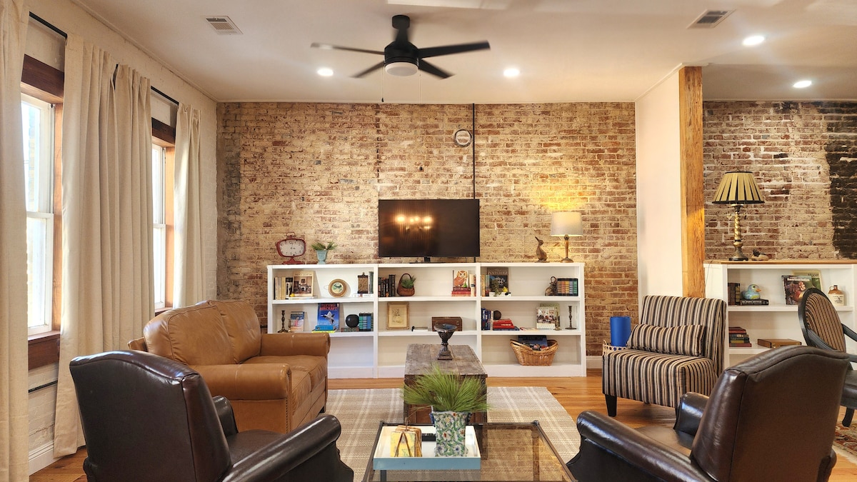 NEWLY renovated loft apartment in the Heart of Downtown Natchez. 3 Blocks from Riverfront. Shopping, dining & events at your doorstep. Executive Apartment. 2 Bed 2 Bath. King Suite with en-suite bath & Queen Suite with hall bath. Open floor plan with full kitchen, dining & living room with tv. Bonus sitting area & designated executive space with free Wi-Fi.