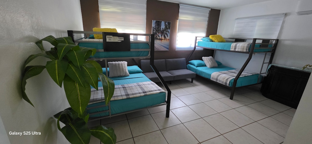 Disfruta de la sencillez de este alojamiento súper céntrico. El area es tranquila completamente privada, con marquesina privada para 2 vehículos. Tiene 2 habitaciones grandes con 2 camas queen y 2 camas full. Cocina equipada completamente. Sala y comedor, para el uso común. televisores en las habitaciones y sala. Internet alta velocidad para trabajar en armonía y comodidad. Perfecto para grupos de 8 personas o menos. podrán ir con la satisfacción de que estarán en un lugar comodo y agradable.