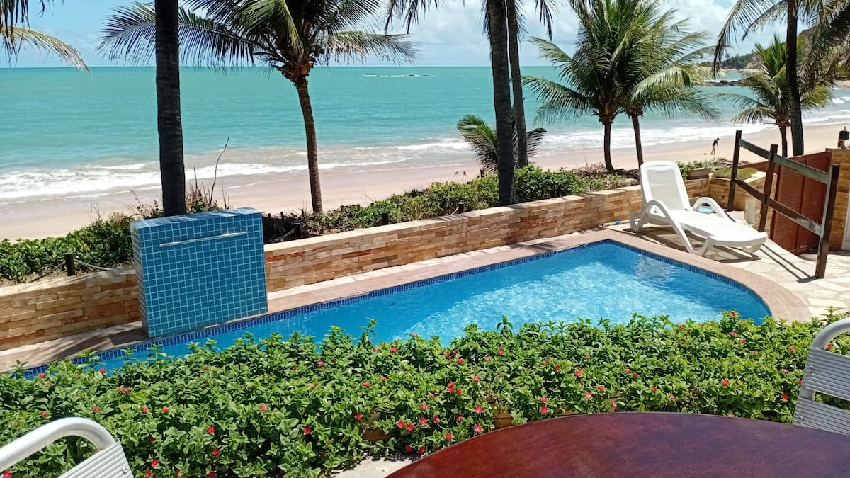 Casa rústica na beira-mar da Praia de Tabatinga recém reformada, com acesso privativo e a poucos passos da praia, com dois quartos sendo uma suíte, banheiro social, cozinha equipada, sala de estar e terraço amplo, com área de lazer incluindo piscina com cascata, hidromassagem e prainha, espreguiçadeiras, churrasqueira, gazebo com pia e bancada, mesa de jantar com bancos de madeira. Jardim iluminado. Terraço com móveis de madeira. Vizinho ao Tabatinga Arte Bar e ao Nord Luxxor Tabatinga.