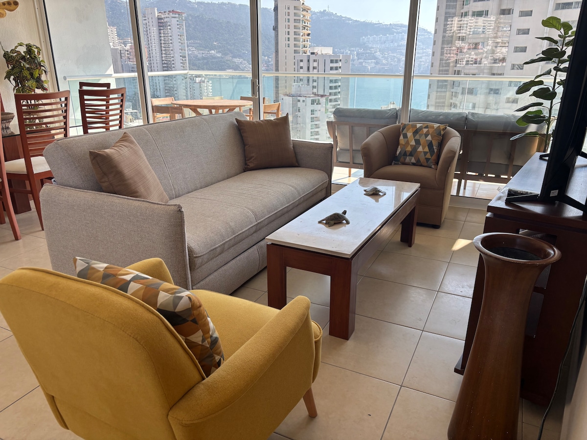 Magnifica vista panorámica de la bahía de Acapulco, localizado en el piso 26 de las Torres Gemelas Acapulco, con acceso a playa privada, area de albercas, vigilancia las 24 horas. Espacio cómodamente amueblado para 4 personas, cocineta integral, muebles de interior y exterior, TV plana de ultima generación, refrigerador, horno de microondas, tostador de pan, cafetera de capsulas, secadora de pelo, plancha, toallas de alberca y baño incluidas.