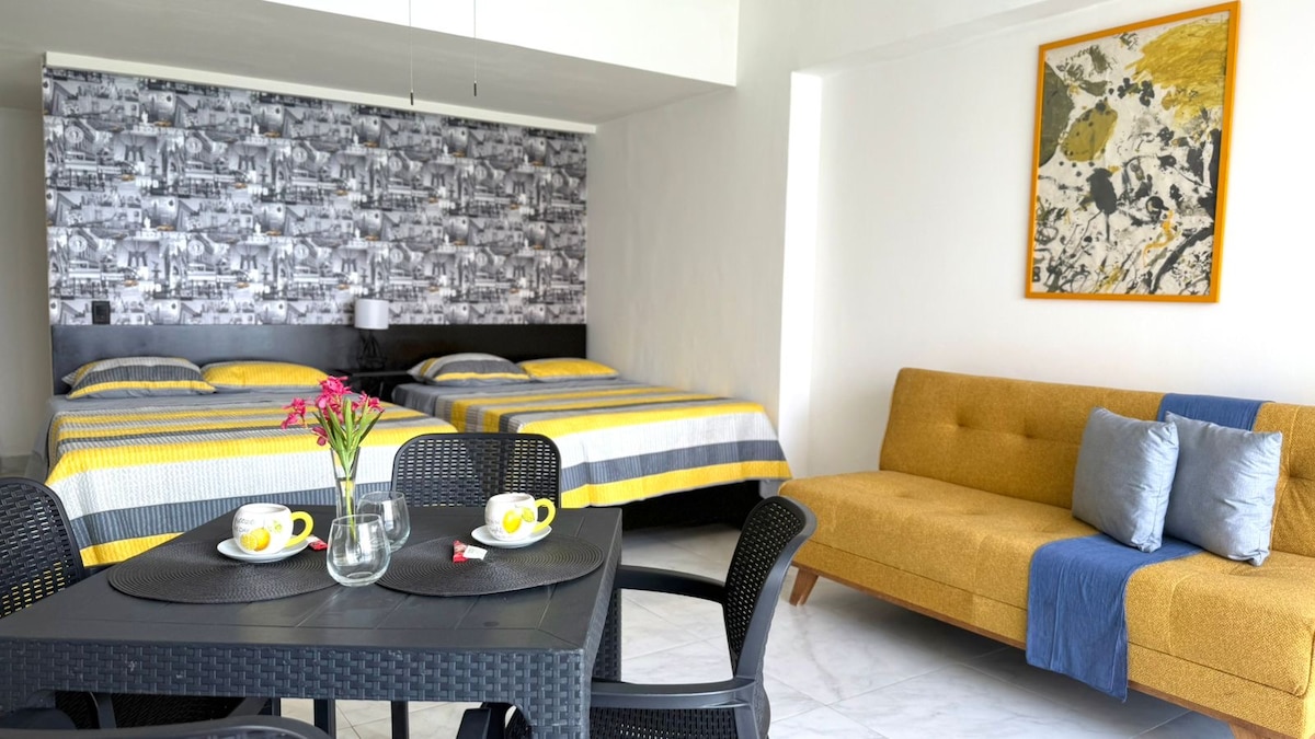 Apartamento de lujo de una habitación con cama matrimonial y colchón inflable matrimonial. Capacidad 4 personas máximo incluyendo niños, (a partir de la 2da persona son $110.00 diarios p/p). Aire acondicionado en recámara y en sala-comedor, cocina equipada, refrigerador, balcón, alberca y playa WIFI privado y en áreas comunes Horario de registro es de 15:00 a 22 hrs, hora de salida es a las 11.00 am, horario flexible cuando se coordina con el propietario Lavadora con la renta de 15 días mínimo