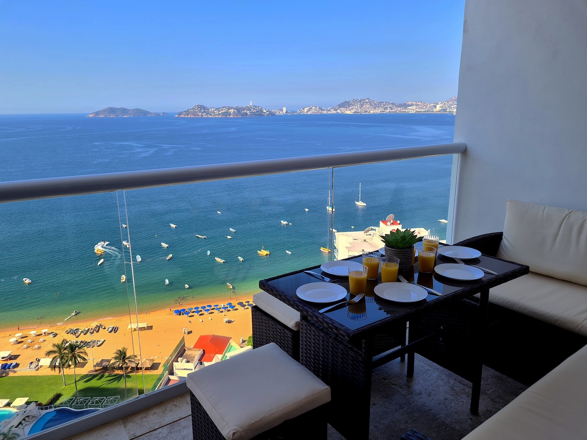 Magnifica vista panorámica de la bahía de Acapulco, localizado en el piso 25 de las Torres Gemelas Acapulco, con acceso a playa privada, área de albercas, vigilancia las 24 horas. Espacio cómodamente amueblado para 4 personas, cocineta integral, muebles de interior y exterior, TV plana de ultima generación, refrigerador, horno de microondas, tostador de pan, cafetera de capsulas, secadora de pelo, plancha, toallas de alberca y baño incluidas.