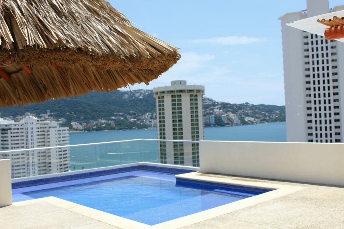 Hermoso Penthhouse, bonito departamento de 2 recamaras, 2 baños ubicado en un Condominio de lujo, cuenta con un Jacuzzi completamente Privado grande. con espectaculares albercas y frente a una de las playas más limpias y bonitas de Acapulco, a unos pasos del Forum Mundo Imperial. Las mascotas pequeñas son bienvenidas, aunque no pueden deambular ni estar en zona de albercas, solo te pedimos traer tus accesorios para tu mascota y su aseo. Ideal para parejas o familias pequeñas. Pregunta por promo