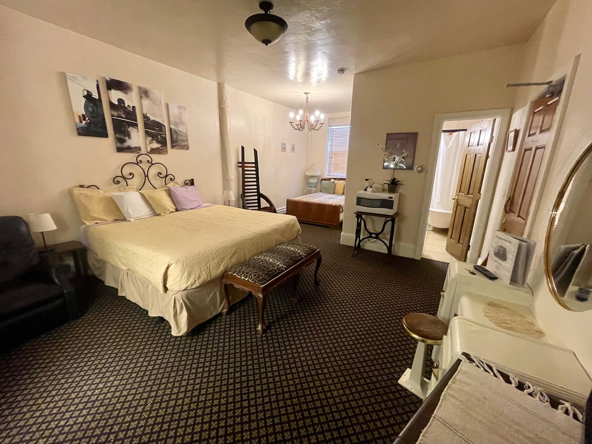 Taste the 1800s in our western school house. Cowboy bunk-house style sleeping arrangement with 3 bunk beds. Also, an inviting kitchenette facility and spacious shower as well as solar lighting, USB charging ports, and a (modern) propane heater. Do the planet a favor and stay at our environmentally friendly, off grid solar powered, largely self sustaining ranch. Ranch Café on site serving hearty homestyle cowboy cooking, by reservation only. We can also provide horse rides.