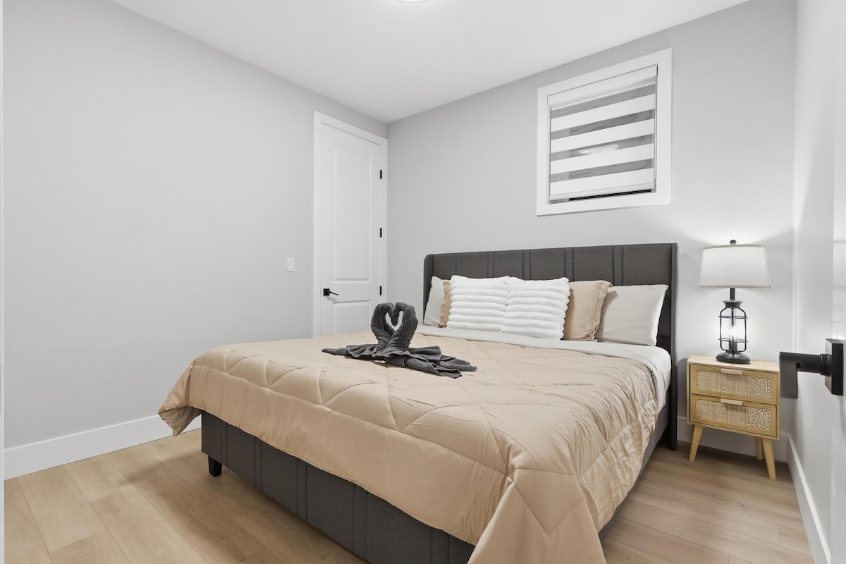 Welcome to your home away from home! This stylish and comfortable suite is perfect for professionals seeking a modern space minutes from downtown. Conveniently located just 10 km from the airport and 5 km to city center. You'll find a bus stop just a few blocks away, along with a coffee shop, Dairy Queen, wine store, and a pizza place—all within walking distance. For outdoor lovers, Confederation Park is only 1.5 km away. Note: Guests must have previous 5★ reviews ✨ Discounts for 2+ nights!