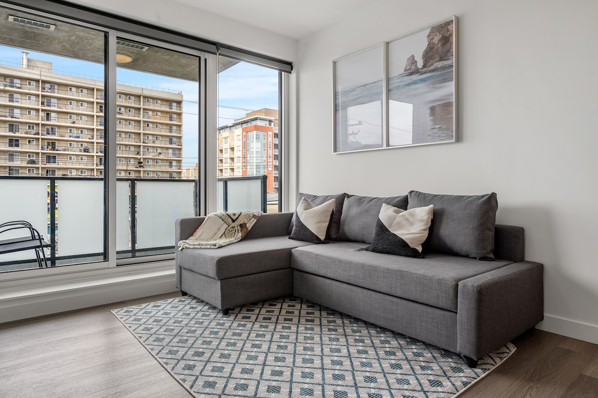 Enjoy a tastefully decorated condo, centrally located in downtown Calgary. The condo offers unique amenities such as; - Rustic Japandi Interior Design Theme done by a local Interior Designer. Each piece was selected with comfort, ease of use and design theme in mind - Offering unique amenities such as a rooftop pool, gym, underground parking, private patio and more - Fully functional kitchen, perfect for cooking - Three sleeping spaces (two queen beds + double sofa bed) - Cable + Hig
