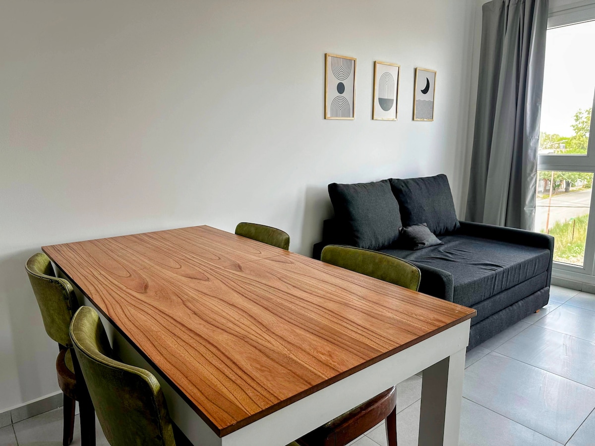 Acogedor departamento de 1 dormitorio en Barrio Arévalo, Cipolletti, ideal para 2/3 personas. Totalmente equipado con cocina eléctrica, calefacción por losa, aire acondicionado, Wi-Fi y Smart TV. Living con sillón cama, mesa y balcón. Ubicación estratégica: cerca del centro, plazas y comercios. Perfecto para parejas, amigos o quienes viajan por trabajo. El departamento además posee cochera del acceso en el edificio.