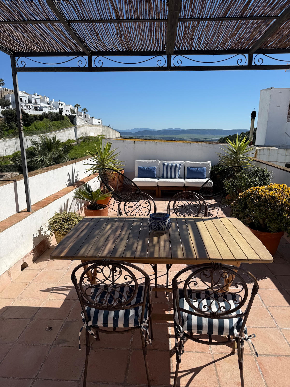 HEAVEN IN THE PUERTA CERRADA. NESTLED INSIDE THE 10TH CENTURY WALL SPACIOUS & ELEGANT You enter a world beyond time and space … Captivated in romantic & magical world, embrace the enchantment of centuries ago … Literally up in the clouds on all 3 luxurious & spacious rooftop terraces. A Dream house with 360° views of Vejer, the ocean, the Castillo & Africa.This home is all of the best Vejer has to offer, with love 2 people. More capacity see CASA PUERTA AZUL & MESON DE ÁNIMAS VTAR/CA/00708