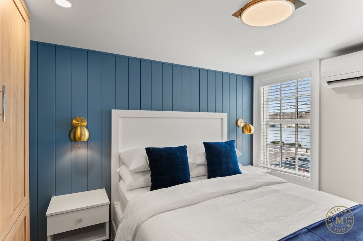 The Lighthouse (202): Direct Waterfront View Let The Lighthouse guide you to relaxation. Perched on the second floor of the Mystic River Inn, this intimate, sun-lit room offers breathtaking, direct views of the Mystic River. Designed for romance, it features a plush Queen bed, wet bar, and a stunning spa-inspired bath with walk-in shower. Sleeps 2. Located on historic Captain’s Row, you are steps from the Bascule Bridge, train, and dining. The ultimate room with a view.