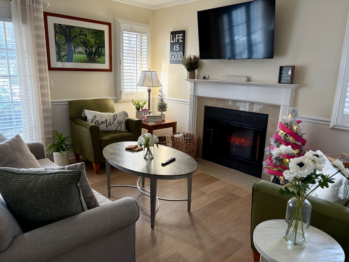 - Sleeps 4 (Queen bed & air mattress) -Heated towel/robe warmer, plush robes, microfiber hair wrap, makeup mirror -Coffee bar w/ french press, espresso machine, fresh coffee beans, flavored syrups, tea -Fully stocked kitchen w/ airfryer, baking essentials, toaster - Access to streaming services is provided (no cable TV) -Barware including cocktail shaker set, champagne flutes, margarita/wine/whiskey glasses -Complimentary toiletries & feminine oriented essentials -Indoor fireplace