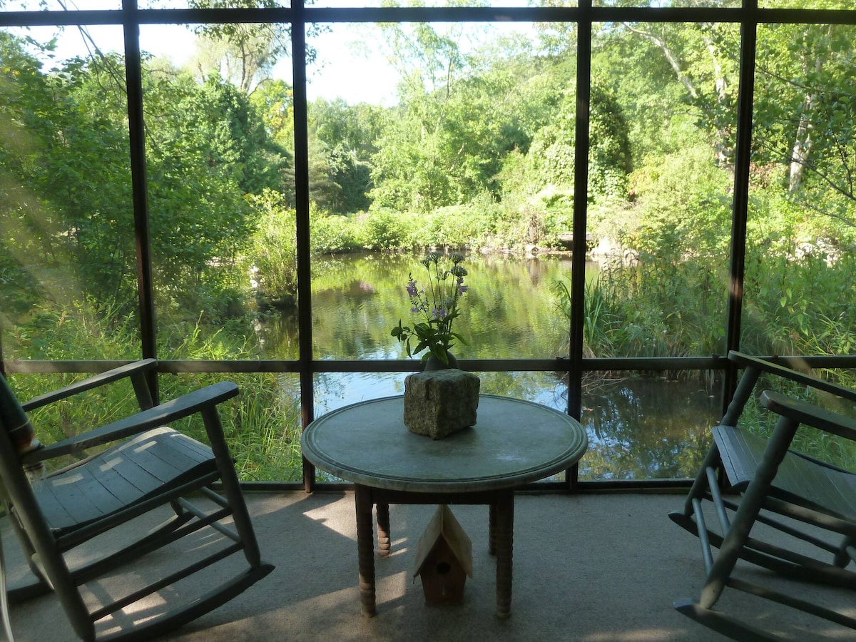 Perfect getaway from the city for couples wanting peace and tranquility and stunning views. A beautiful waterfront one bedroom guesthouse, one and one-half miles from downtown Mystic CT. Beautifully decorated with art and antiques. Kitchenette, full bath and loft bedroom. Queen bed. Air conditioning and heated. Belgian linen bedding! Private patio. Dock. Kayak/Canoe rentals close by. Internet.