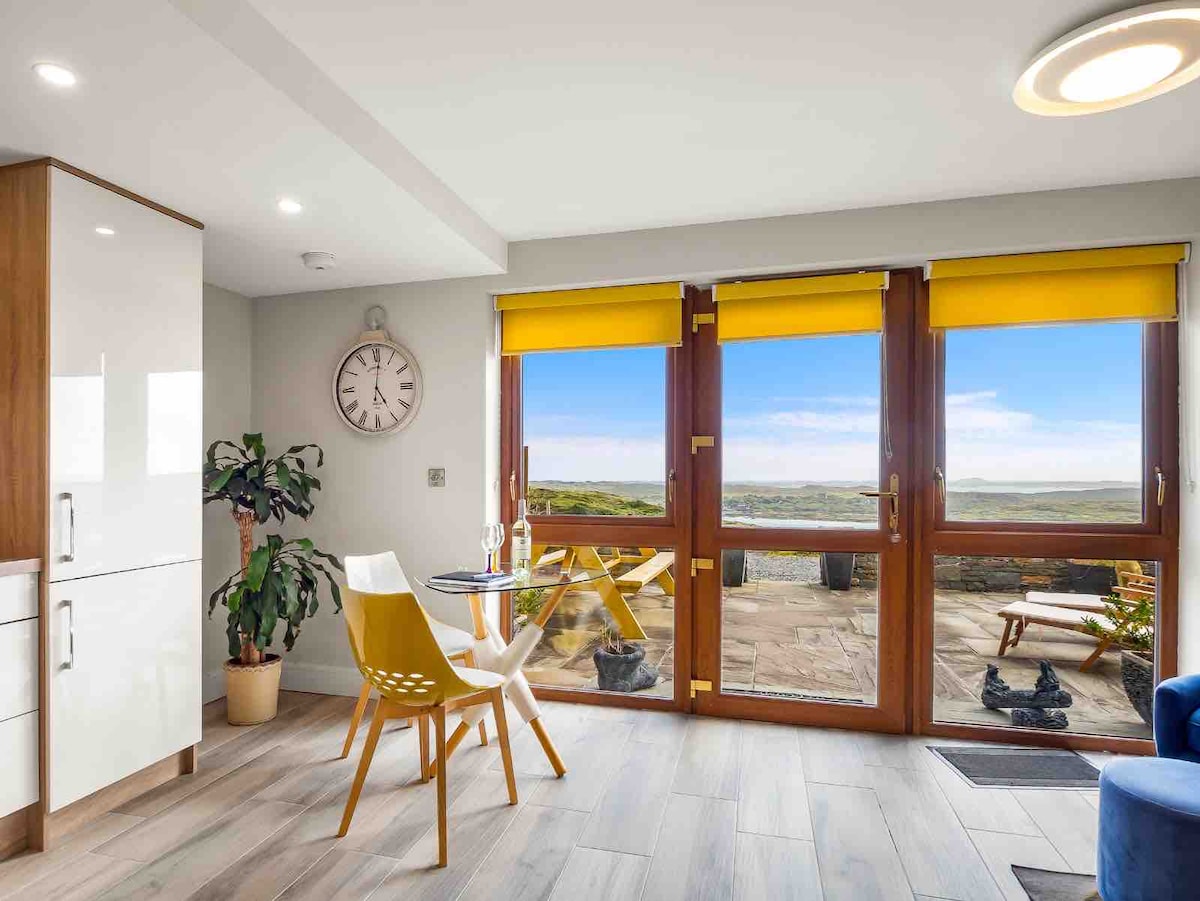 The Manor Apartment: panoramic views of Clifden Bay from this newly built contemporary apartment on the famous Sky Road. A perfectly proportioned space with a full kitchen, dining and living area, a double bedroom with adjoining bathroom, and a private patio with sea views. Morden, stylish, & luxurious accommodation in the perfect scenic location for exploring Clifden and Connemara. Your host, Eileen, lives in the ajoining house; expect warm cèad míle fáilte while respecting your privacy.