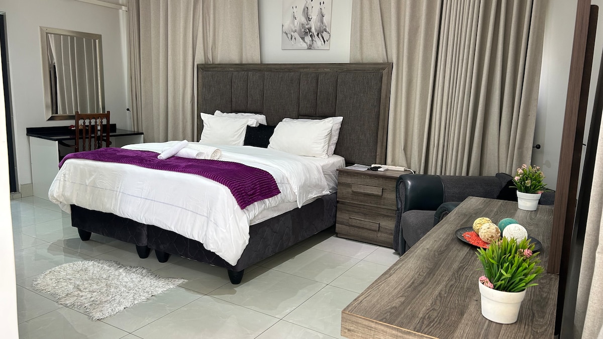 Modern, stylish room in Golden Acres Guest Lodge Fine dining at our on-site restaurant Sleep in premium 400-thread count Egyptian cotton linens Smart entertainment and high-speed internet included Safe, peaceful setting close to city attractions Ideal for restful nights and stress-free stays