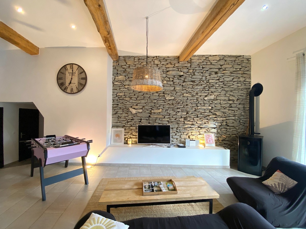 Une maison pleine de charme, où se mêlent la pierre et le bois, dans laquelle vous vous sentirez chez vous. Une décoration épurée et nature qui plaira au plus grand nombre. Elle a été rénovée en 2018, vous bénéficierez donc d'un logement tout confort. Elle est dotée de 3 chambres, avec lits queen size. L'une d'entre elle dispose également d'une mezzanine avec un lit et un espace bureau. À l'extérieur, une piscine privée et un jardin sans vis-à-vis vous offriront de beaux moments de détente.