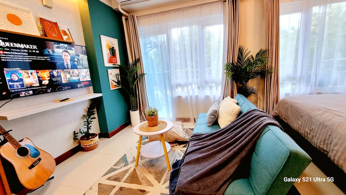Kick back and relax in this calm, stylish studio unit near Mactan-Cebu International Airport! Inclusions: - Free access to the Pool and Gym - Towels and toiletries - Complimentary Coffee - Hairdryer - Clothes iron - Extra bed linens (upon request) - Wi-Fi About our space: - Pet-friendly - 32 sqm with a balcony facing the pool - Queen-sized bed with 2 bedside outlets - Work desk - Hot and cold shower - Dining area - Smart TV with Netflix - Wardrobe - Kitchen - Washing Machine