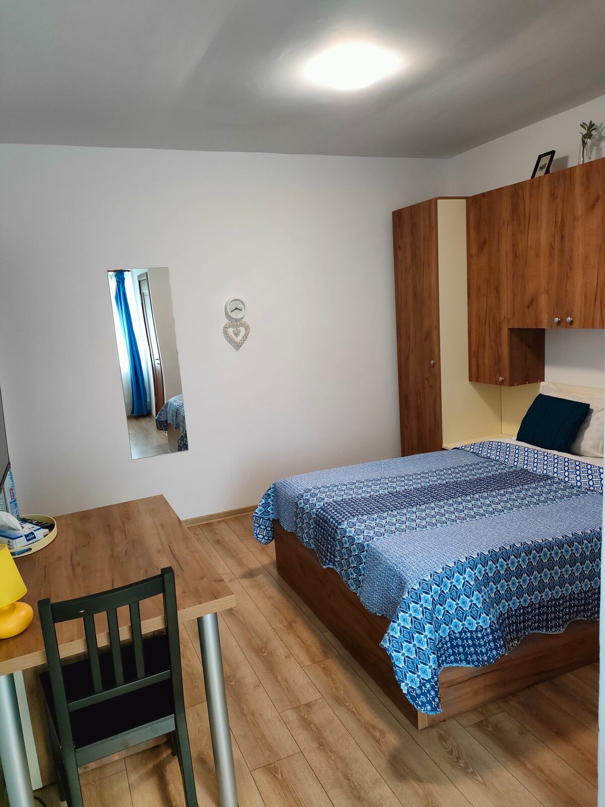iVAVƏV byTheSea este un mini hotel amplasat în unul din cele mai bune cartiere din Constanța și la o distanță de 150m de plaja. Proprietatea este compusă din 2 corpuri, fiecare având o mini grădină. Această cameră se află la etaj și are dotări pat matrimonial și fotoliu extensibil Smart tv, wifi, frigider minibar, aer condiționat, dulapuri multiple, masă/birou cu scaune, baie privată cu duș. Tot această cameră plus încă alte 2, împart o bucătărie comună complet utilată și o grădină interioară.