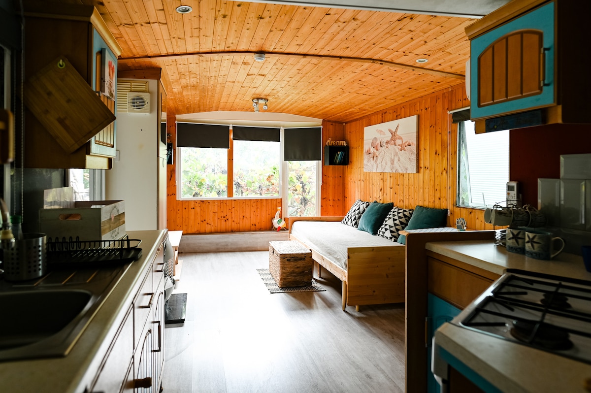 Căsuța mobilă poate acomoda între 2 și 4 persoane ( numărul de persoane se selectează din aplicație ) având un dormitor cu pat matrimonial și baie proprie, bucătărie utilată, living cu canapea extensibilă foarte confortabilă pentru 2 persoane, cu baie proprie. In fata căsuței este amenajata o terasa. Cele 3 căsuțe deținute sunt situate în aceeași curte.
