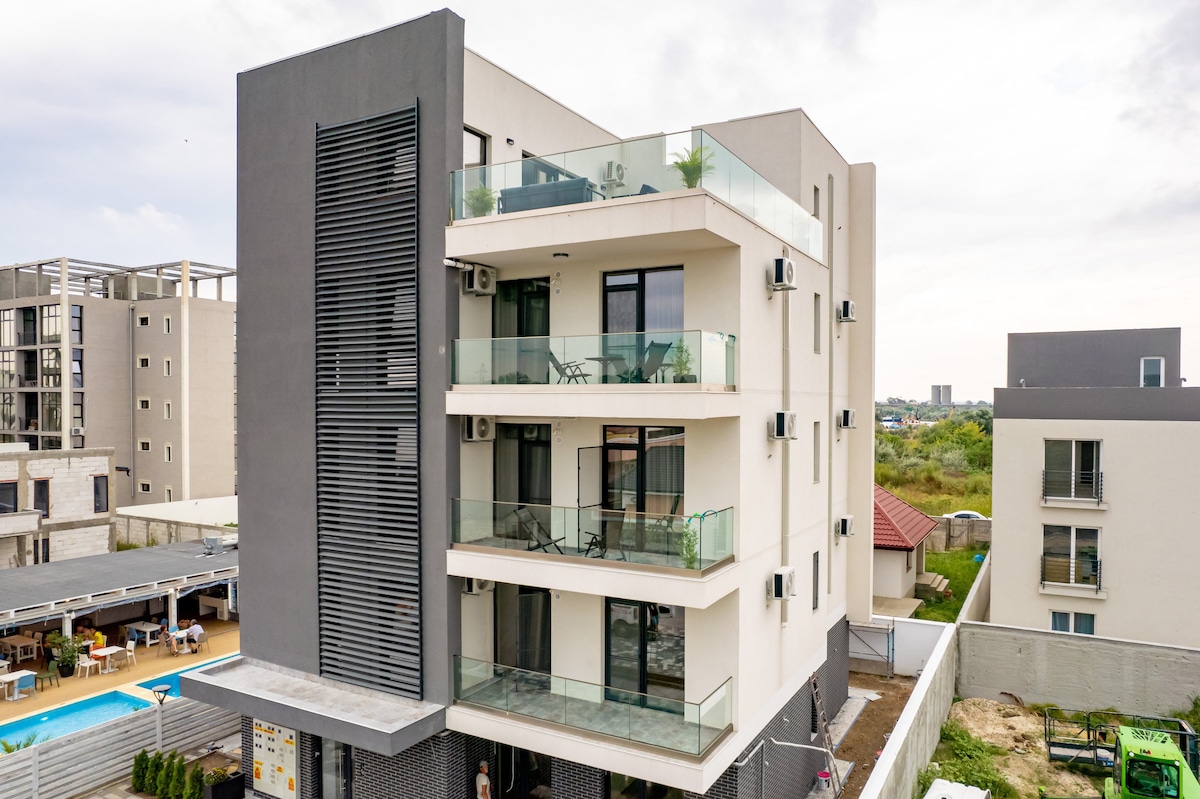The 2‑room apartment located just 330 m from the sea, in the heart of Mamaia Nord, offers the ideal setting for families or friends group who want a relaxing holiday close to all major attractions. The fact that you are hosted by a superhost, attentive to details and to each guest’s needs, gives you the guarantee of a successful stay filled with beautiful moments and good value. The complex features a seasonal swimming pool, generous green areas, plenty of open space for play and relaxation.