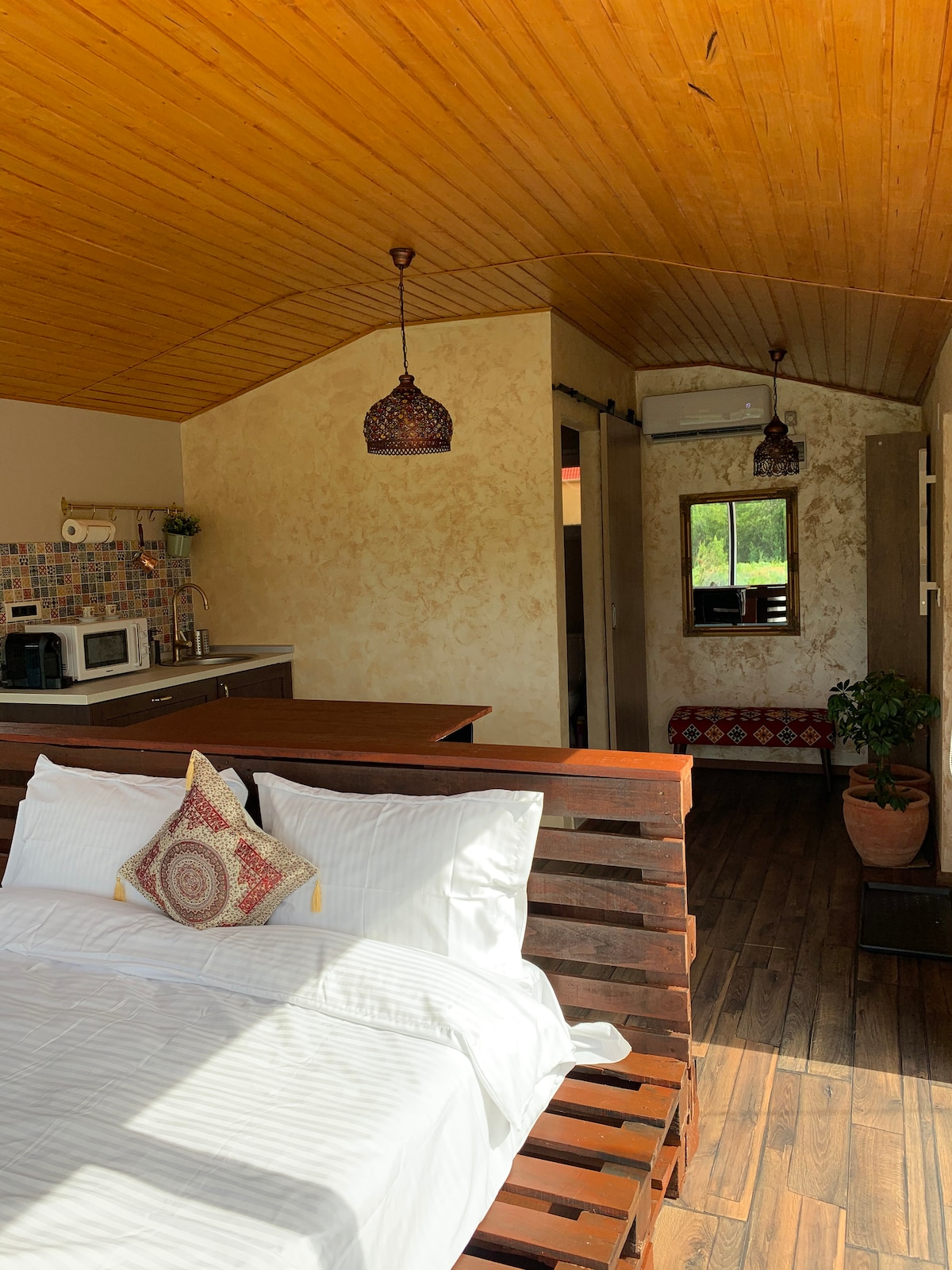 Pura Vida Seaside Tiny house village is located steps away from the beach of Vama Veche and consists of more then 20 tiny houses, modular homes and premium glamping tents. As facilities we have grill for barbecue, jacuzzi for a fee, free parking for our clients, wireless internet in some areas, free playground for children, very pet friendly owners and central location. The Woody house is very spacious and offers a king size bed of 180 cm x 2 meters and an expandable sofa.